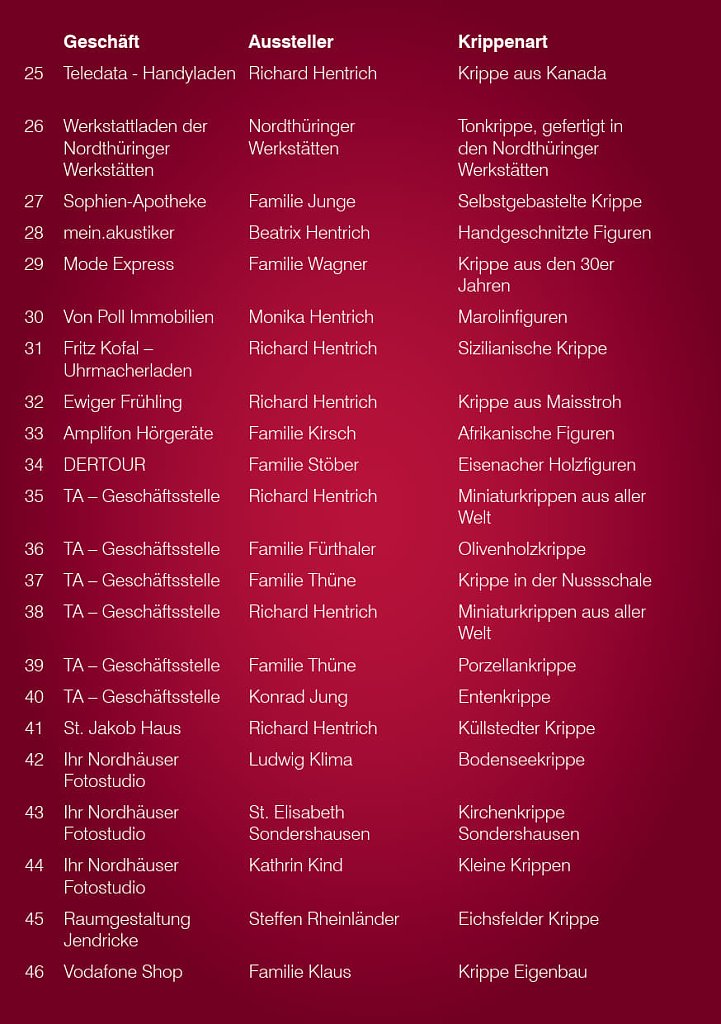 Der 20. Krippenweg lädt zum Schlendern im Stadtgebiet ein. Hierbei werden fast 100 Krippen in den Schaufenstern unserer Geschäfte der Stadt Nordhausen ausgestellt. Seit 2005 organisiert Pfarrer i.R. Richard Hentrich den Nordhäuser Krippenweg, in dessen Rahmen Geschäftsleute Weihnachtskrippen von Gläubigen in ihren Schaufenstern ausstellen.