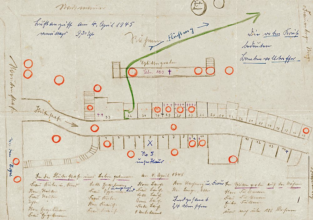 So stimmen die namentlichen Angaben zu den Toten auf der Skizze mit den Registrierungen der Bergungstrupps überein. Auch gibt es weitere Zeitzeugenberichte zu dem geschilderten Fluchtweg Richtung Nordosten. Die Berichte weisen aber auch darauf hin, dass im Splittergraben am Rähmen wesentlich weniger Menschen umgekommen sind. Der Graben war zwar voll mit Menschen, aber viele begannen von hier ihre Flucht aus der Stadt. In den Tagen nach dem Angriff wurden 27 Leichen aus dem Splittergraben am Rähmen geborgen.