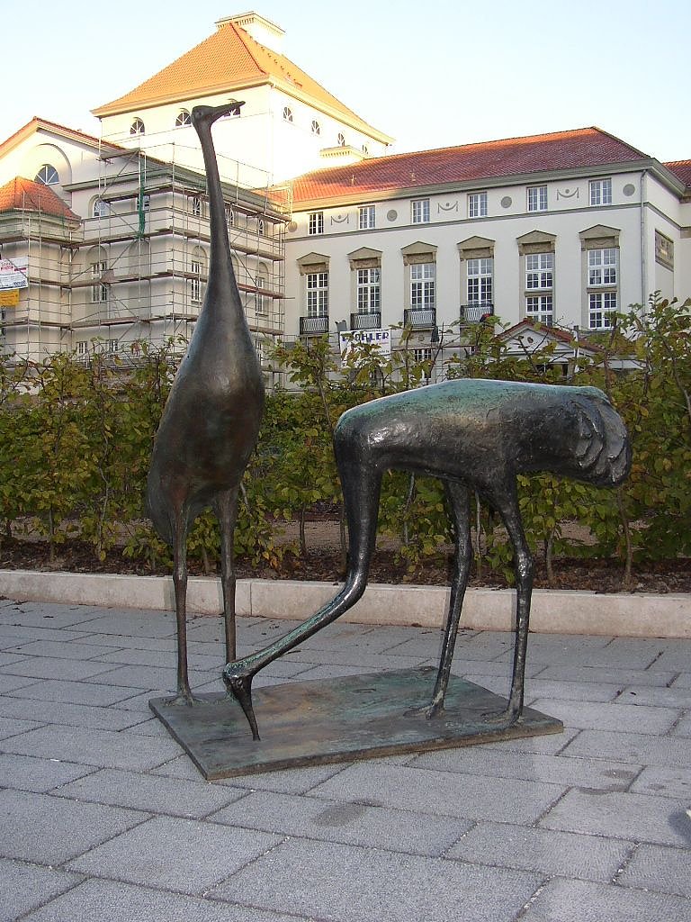 Zum Bild: 2003 war das reparierte Kranichpaar wieder unmittelbar an der Töpferstraße aufgestellt worden (Foto)– nachdem die verschollene zweite Vogel-Figur nachgegossen wurde. Nach der Aufstellung wurde es immer wieder beschädigt, auch, nachdem es später in den Garten vor dem Theater gesetzt wurde. Archivfoto: Pressestelle Stadt Nordhausen