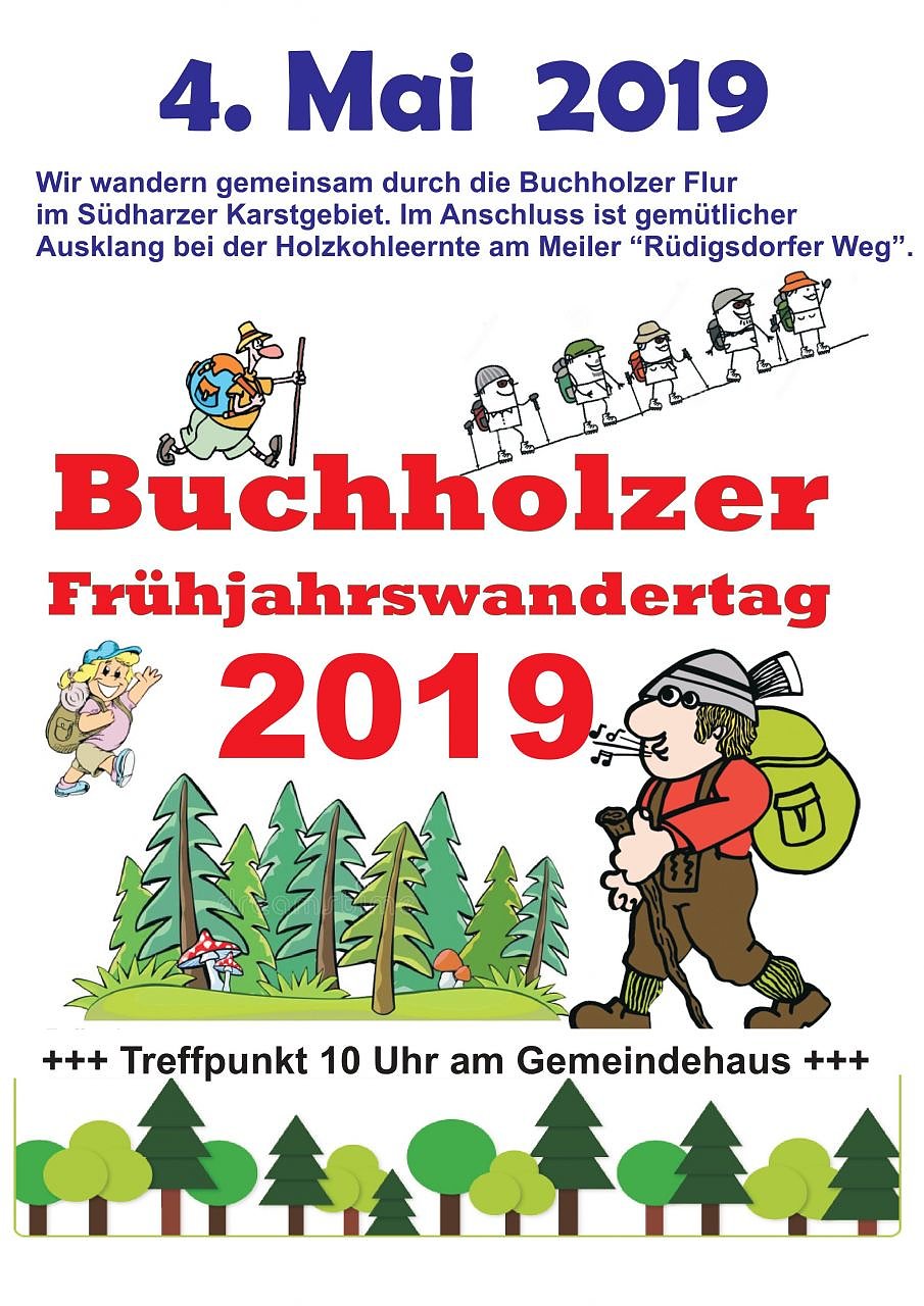 Nordhausen (psv) Am 4. Mai 2019 findet der Buchholzer Wandertag im Nordhäuser Ortsteil statt. Start ist 10 Uhr am Gemeindehaus in der Buchholzer Landstraße 30. Die Route führt durch die Buchholzer Flur über den Karstwanderweg zur Windlücke. Nach einem kleinen Abstecher zu den Wasserbüffeln führt die Wanderung weiter über Petersdorf, den Alten Truppenübungsplatz passierend mit Ausgang Rüdigsdorferweg am Traditionsmeiler. Hier kann beim Köhlern und der Holzkohlenernte zugeschaut werden. Die Verpflegung während der Wanderung erfolgt aus dem Rucksack. Am Meiler wird dann für das leibliche Wohl gesorgt sein.