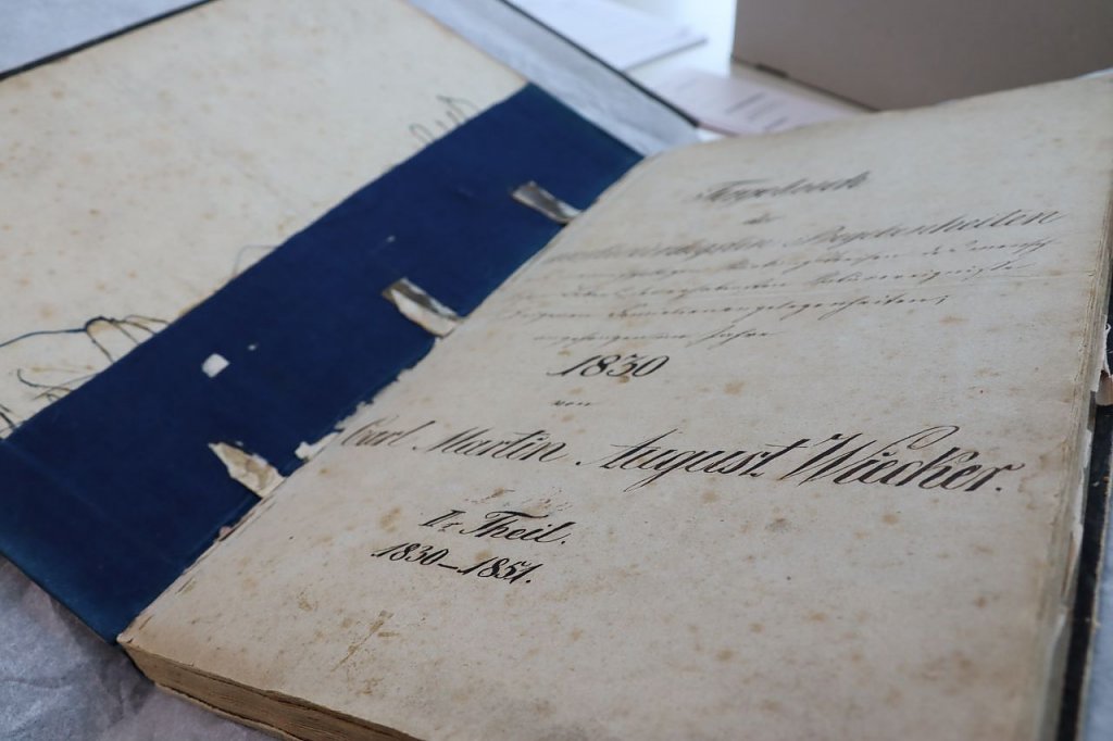 Für den Anfang der 1990er Jahre gegründeten Lions Club Nordhausen übergaben nun der aktuelle Präsident Michael Görk und die Clubmitglieder Dr. Manfred Schröter und Holger Richter die beiden Bände im Beisein des Oberbürgermeisters Kai Buchmann als Dauerleihgabe dem Stadtarchiv Nordhausen. Michael Görk schildert, dass die Mitglieder des Lions Clubs von den fast 60 Jahren umfassenden Aufzeichnungen des Nordhäuser Handwerkers beeindruckt waren. Es war für uns daher selbstverständlich, diese Tagebücher zu erwerben und dem Stadtarchiv zur Verfügung zu stellen. Darüber hinaus möchten wir auch zeigen, dass die Lions trotz Pandemie und Kontaktbeschränkungen in ihrem Engagement eine verlässliche Größe in der Stadt sind, so der Präsident weiter. Die beiden dicken Lederbände enthalten Beobachtungen, Eindrücke und Berichte des Nordhäuser Bäckermeisters Carl Martin August Wiecker (1818 – 1900), reichen mit ihren Einträgen von 1830 – 1889 und sind zudem mit Zeitungsausschnitten u.a. Beilagen gespickt. Ein anderes vergleichbares Zeitdokument für diese Epoche ist aus Nordhausen bislang nicht bekannt, freut sich Stadtarchivar Dr. Theilemann.