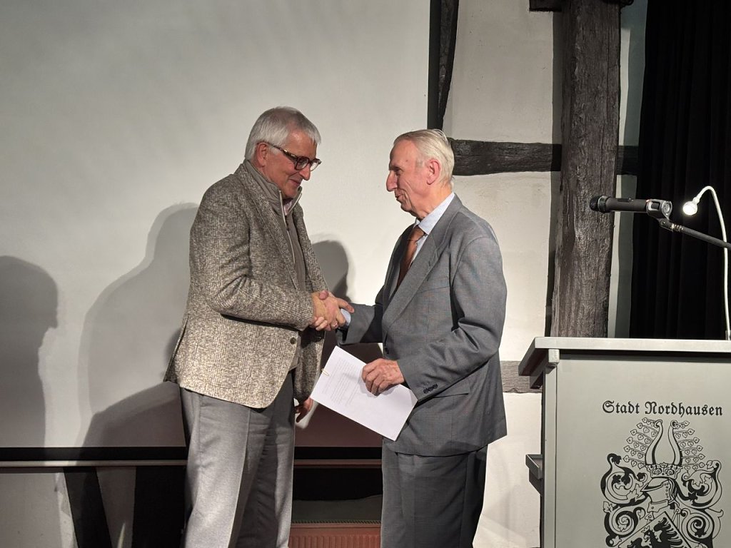 - Für die Historische Kommission für Thüringen leiteten Prof. Dr. Werner Greiling und Dr. Martin Sladeczek die Preisverleihung ein. Geehrt wird 2025 der Nordhäuser Geschichts- und Altertumsverein e.V., der an die Arbeit des bereits 1870 gegründeten Geschichtsvereins anknüpft. Seine Mitglieder erforschen die Geschichte der Stadt, des Landkreises Nordhausen sowie der umliegenden Orte, dokumentieren die Ergebnisse und machen diese der Öffentlichkeit zugänglich. Regelmäßig werden von verschiedenen Autoren Aufsätze zu historisch relevanten Themen verfasst und in den "Beiträge[n] zur Geschichte aus Stadt und Kreis Nordhausen" veröffentlicht. Darüber hinaus organisiert der Verein monatliche Vortragsabende, Exkursionen und Ausflüge und unterstützt die Erinnerungs- und Gedenkarbeit in der Stadt. Mit derzeit knapp 100 Mitgliedern gehört der Nordhäuser Geschichts- und Altertumsverein e.V. zu den größten Geschichtsvereinen in Thüringen. Er wirkt in beispielgebender Weise für die landesgeschichtliche Forschung und die historische Bildungsarbeit mit.