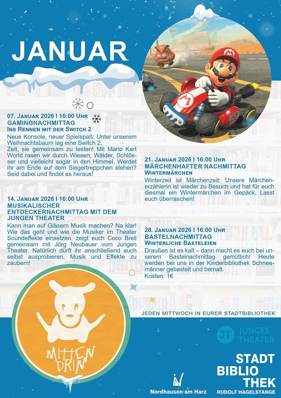 Nordhausen (psv) Am Mittwoch, dem 14. Januar 2026, um 16:00 Uhr, lädt MITTWNDRIN der Stadtbibliothek Nordhausen zum musikalischen Entdeckernachmittag mit dem Jungen Theater ein. Kann man auf Gläsern Musik machen? Na klar! Wie das geht und wie die Musiker im Theater Soundeffekte einsetzen, zeigen Coco Brell und Jörg Neubauer. Natürlich dürfen die Kinder und Jugendlichen anschließend auch selbst ausprobieren, Musik und Effekte zu zaubern!